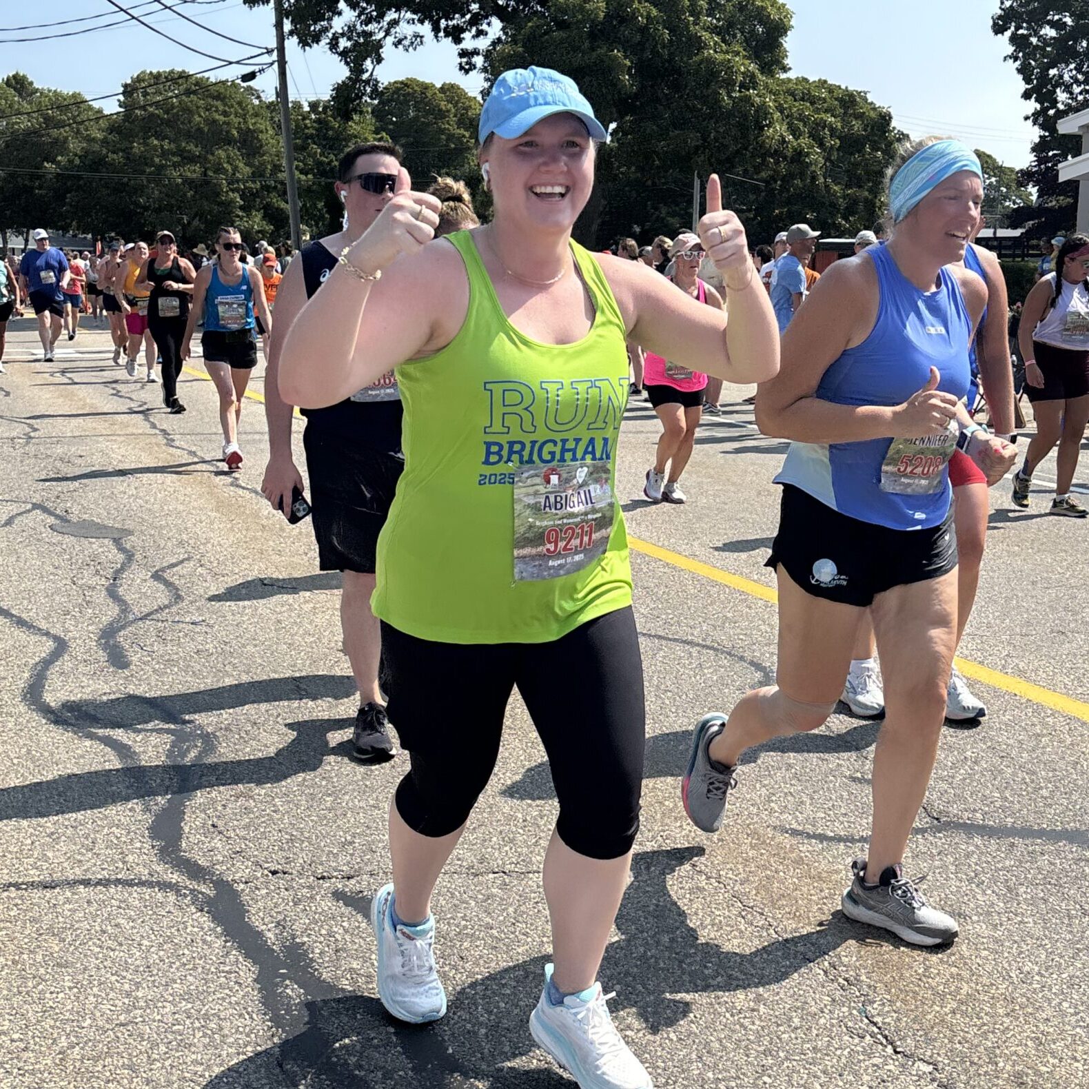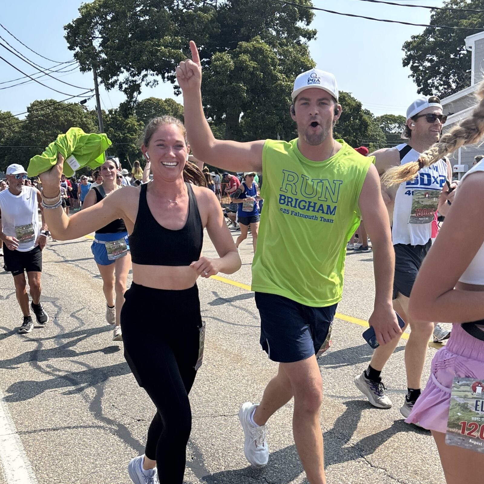My husband is here today thanks to the care he received at the Brigham after battling cancer. And in September, we welcomed our first baby girl. We run Falmouth to give back.”